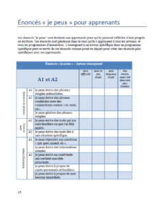 Les énoncés « je peux » sont destinés aux apprenants pour qu’ils puissent réfléchir à leurs progrès en écriture. Ces énoncés sont généraux dans le sens qu’ils s’appliquent à tous les niveaux et à tous les programmes d’immersion.