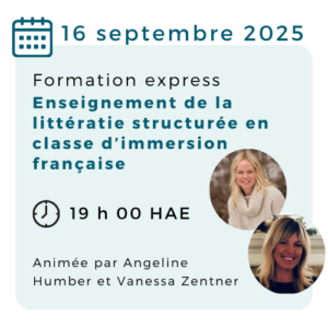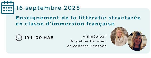 Joignez-vous à nous en direct pour apprendre et enrichir vos compétences en immersion et poser vos questions à Angeline Humber et Vanessa Zentner, deux expertes en littératie structurée!
