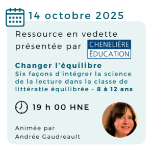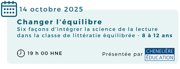 À cette occasion, Andrée Gaudreau présentera le deuxième tome de l’ouvrage Changer l’équilibre, qui propose une approche équilibrée de l’enseignement de la lecture, appuyée sur les plus récents résultats de recherche en neurosciences, en sciences cognitives et en développement de l’enfant âgé de 8 à 12 ans. Cette rencontre en direct comprendra un survol de 45 minutes de Changer l’équilibre: 8 à 12 ans, consacré à la compréhension en lecture. Les autrices y explorent six éléments essentiels au développement de cette compétence :